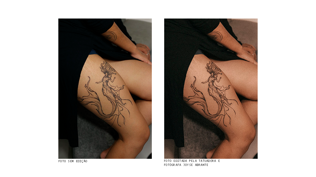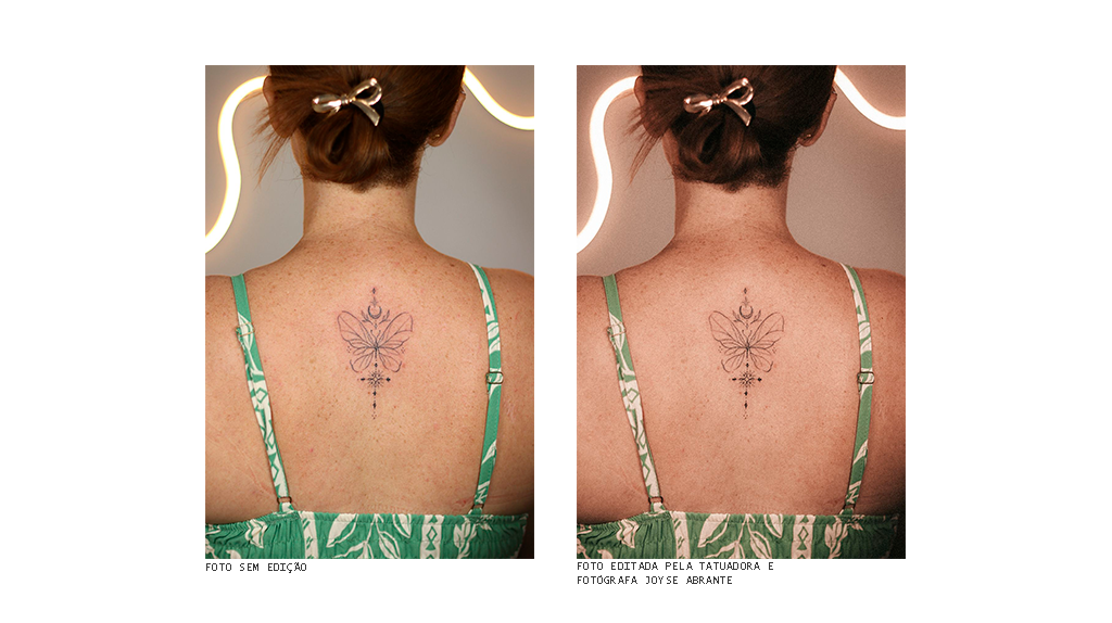 Joyse: Fotografo com luz neutra e faço balanço de branco manual. Na edição, comparo com a tatuagem real em tempo real pra não exagerar na saturação.