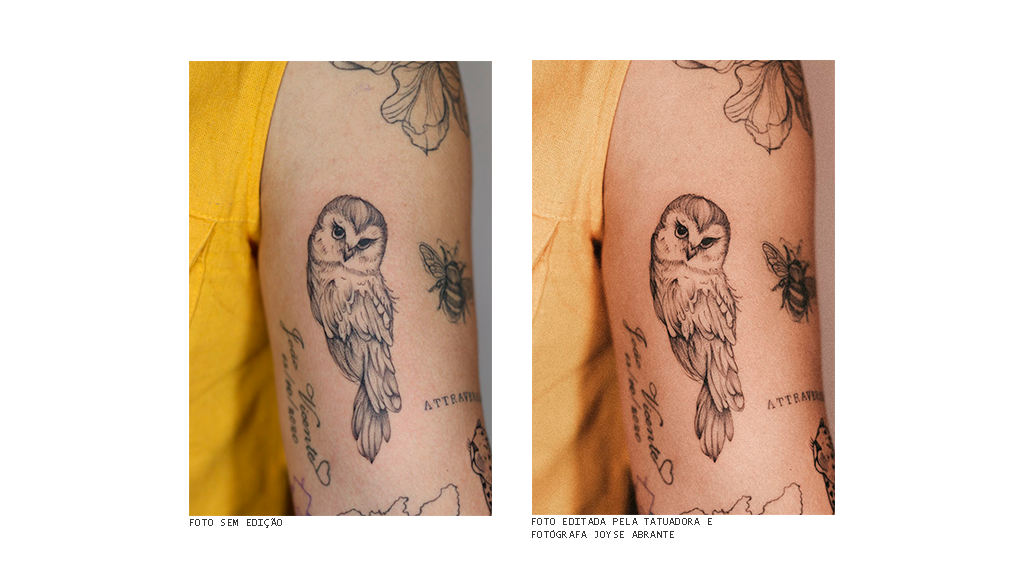Joyse: Em relação a edição eu como sempre uso as mesmas configurações, e o local e luz são sempre as mesmas. Criei um preset (Lightroom) que faz os ajustes de exposição, balanço de branco, (gosto de deixar minhas fotos mais quentes) contraste leve (suave) e tiro o vermelhidão ao redor, nas minhas edições só isso é essencial. Gosto de diminuir o contraste com moderação só pra dar leveza nos detalhes. Nada de modificar as cores da tinta ou apagar alguma parte da tattoo.