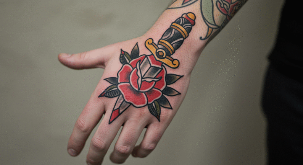 O estilo tradicional americano nasceu para ser ousado e durar. Seus traços grossos e cores sólidas são perfeitos para resistir ao desgaste da pele das mãos. É a escolha mais segura e estilosa para a região.