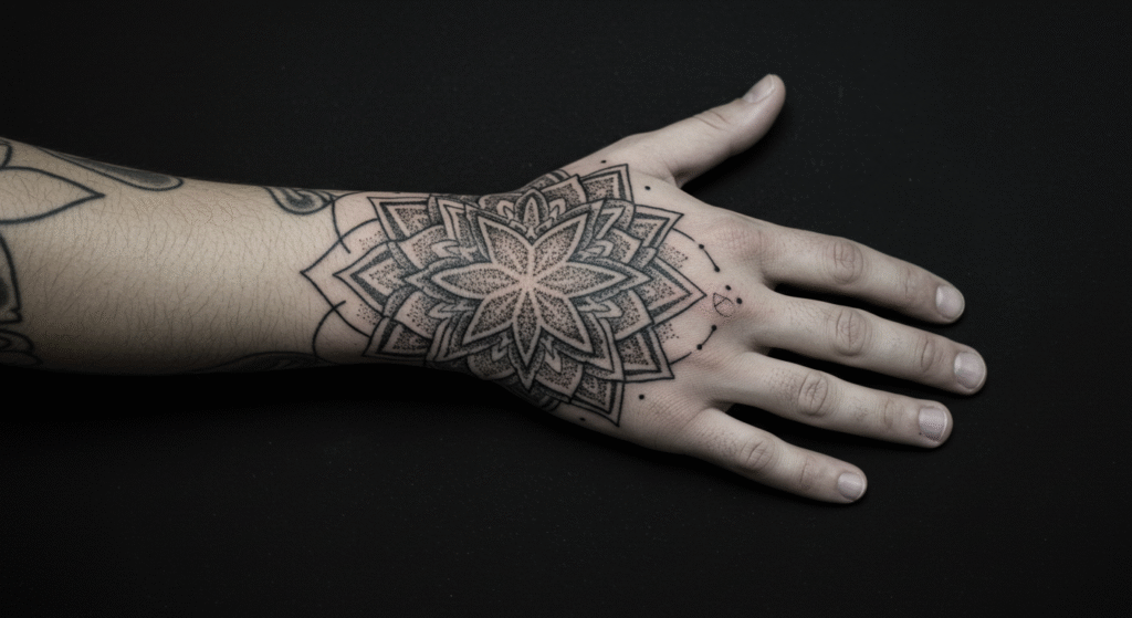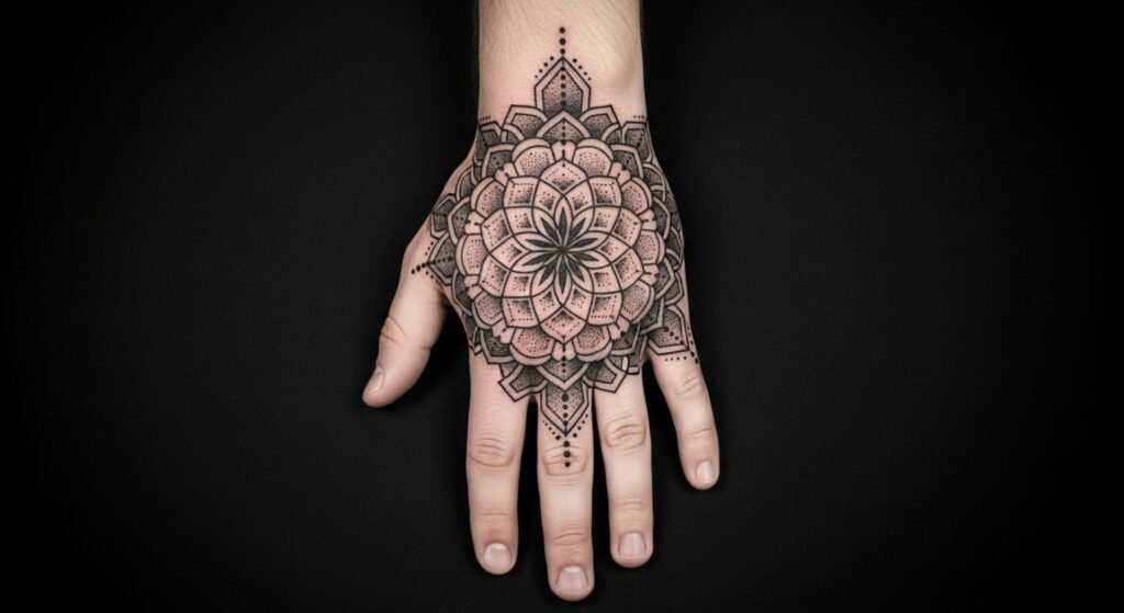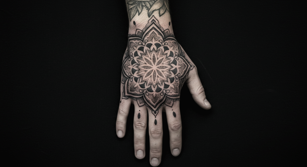 - Geometria Sagrada: Uma mandala no dorso da mão é um design poderoso que simboliza o universo e o equilíbrio.